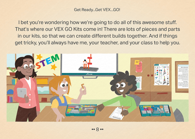 The VEX GO Kids were designed for Elementary students. They’re featured with educational robots and a storybook was made to help illustrate the complex concepts in an approachable way.