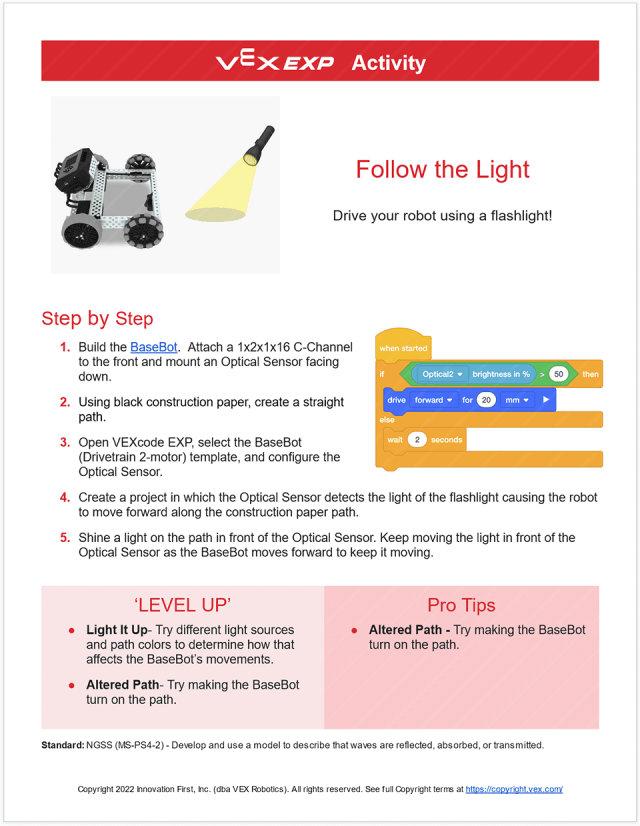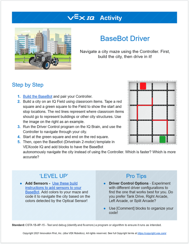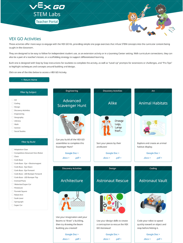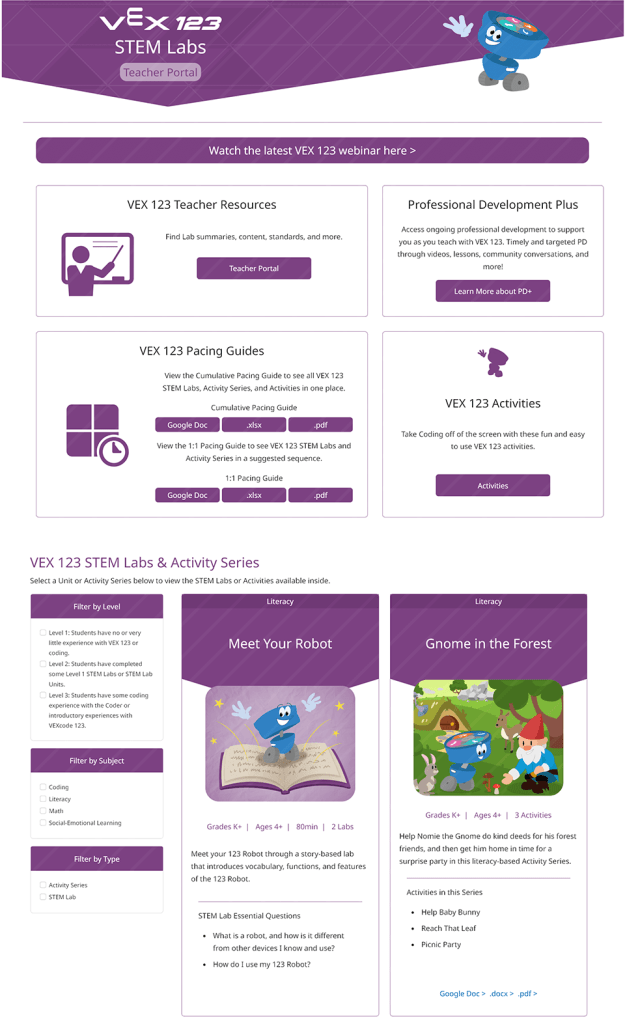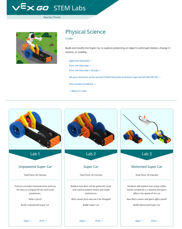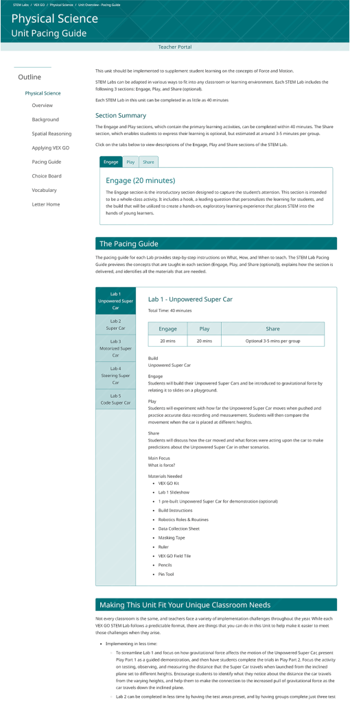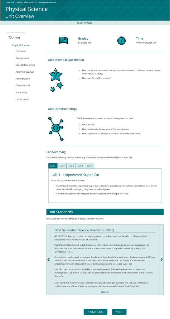 The VEX STEM (Science, Technology, Engineering, Math) Labs are a collection of educational materials to teach robotics. The goal was to display the information in an engaging, modern design that could be applied to the many different robotics platforms VEX provides. Each VEX Robotics platform is defined by a color which can be swapped in the design for a consistent style.